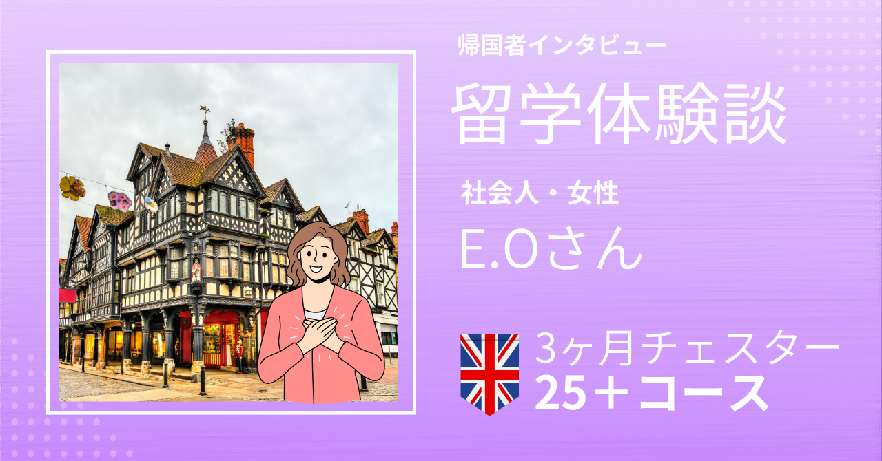 寺村さんのおかげで、素敵な街と人たちに出会うことが出来ました。当初はロンドンの予定で、チェスターは聞いたこともない街でしたが、チェスターに決めてよかったです。この機会を通して、イギリスが好きになりましたし、英語も今後頑張って勉強しようというモチベーションにもなりました。本当にありがとうございました。また機会がありましたら、よろしくお願いいたします。