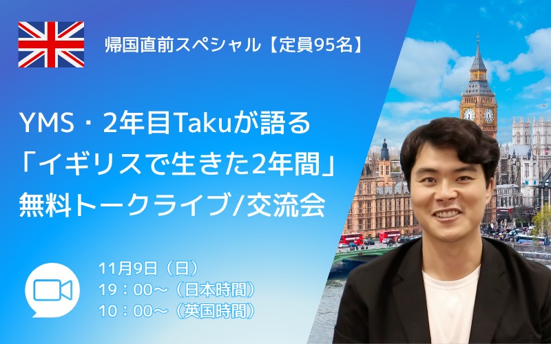 【無料オンラインイベント】YMSリアル・トークライブ 〜2年目Takuが語るイギリスのホント〜